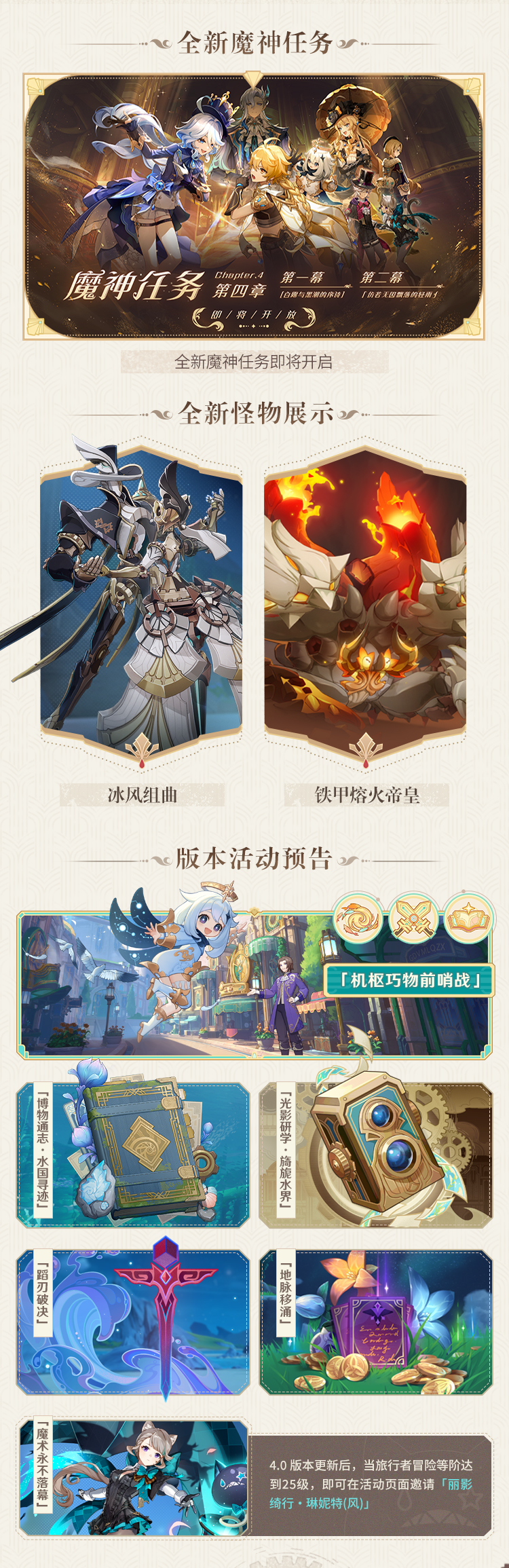 除了上面所说的之外,直播还介绍了4.0的活动安排,这些活动除了第一个和第二个,剩下的老玩家一看图标就知道活动内容了。对玩家来说比较好的消息是,在4.0版本做活动就能免费得到四星角色琳妮特,可以省下来不少原石。