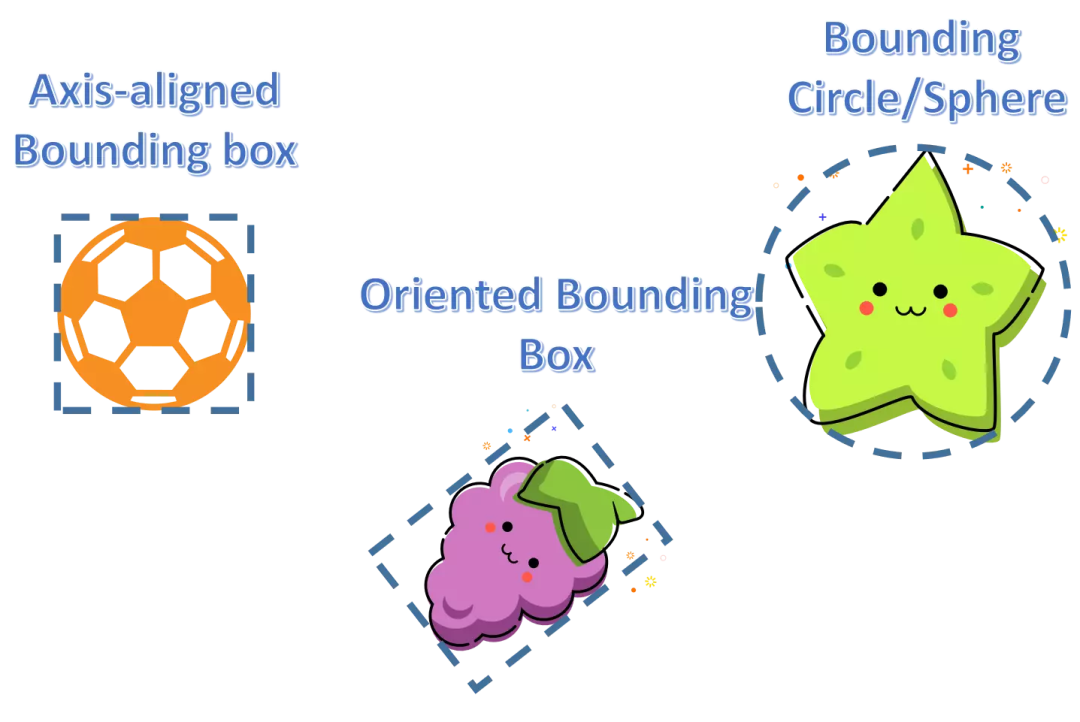 最常用的BoundingVolume方法有AABB(axis-alignedboundingboxes),OBB(orientedboundingboxes),和BoundingCircle/Sphere,其示意分别如下图所示: