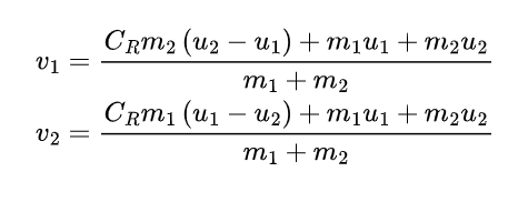碰撞可以分为弹性碰撞与非弹性碰撞(包含完全非弹性碰撞和部分弹性碰撞),首先,看弹性碰撞,对于两个理想球体发生弹性碰撞,其过程中动量和能量都守恒,设其质量分别为m1和m2,初始速度分别为u1和u2,碰撞后速度为v1和v2,则有[12]: