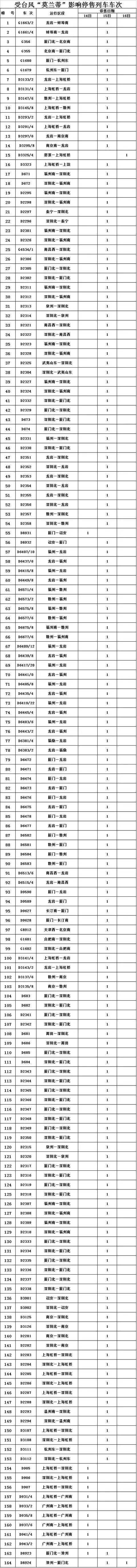 昨日,南昌铁路局官方微博发布消息:为减少台风影响,南昌铁路局将停售9月14日至16日途经上述线路运行共166列动车车票,其中9月14日11列,9月15日153列,9月16日2列。