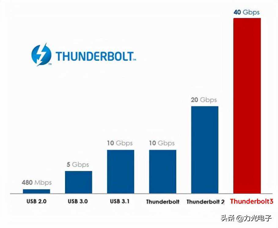 雷电(ThunderBolt)接口,之前少数人有听说过雷电2,当时还是苹果和英特尔合作开发,专属于苹果电脑的超高速接口。那会还没有几的概念,好多人还在用的8G/16GU盘。