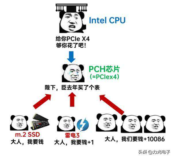 PCH这个尚书不好当,上面皇帝给你拨款有限(约PCIex4通道),对下你有一堆侍郎等着要钱(、雷电3等)。