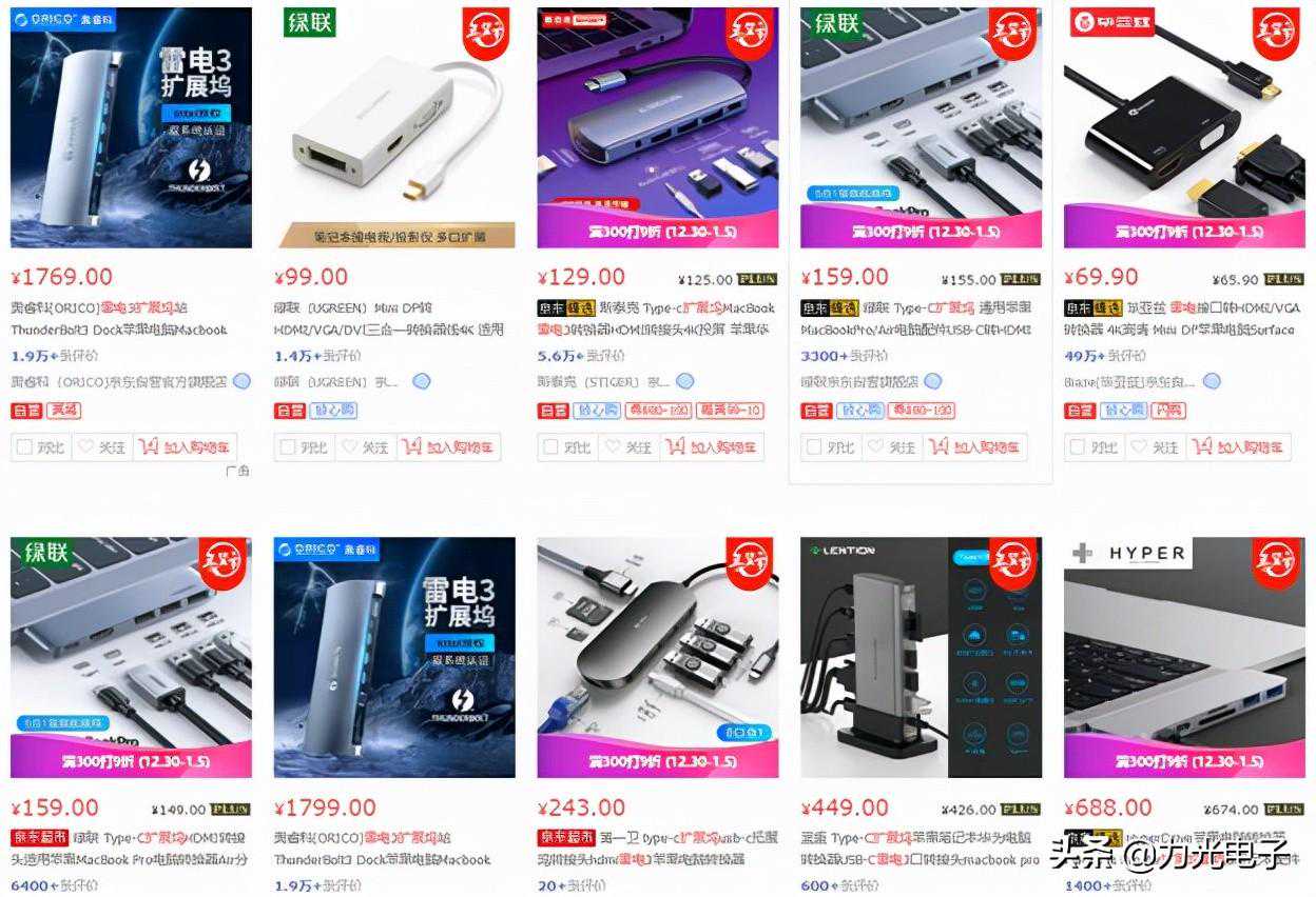 除了线材还有各类Type-C扩展坞/硬盘盒,首先在名称上就经常鱼龙混杂,把产品描述放上Type-C和雷电3俩关键词增加电商曝光率是常事。一个Type-C扩展坞通常可以给雷电3接口用,但是一个雷电3扩展坞,插到全功能Type-C接口上可不一定能正常工作,雷电3硬盘盒也是一样。