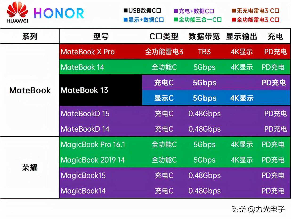 而MateBook13是个行业特例,整机就俩C口,一个能充电不能显示,一个能显示不能充电,应该是之前MateBookX一代的方案。