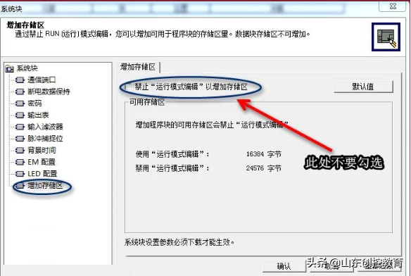 1在软件的编辑界面的“系统块”-“增加储存区”中的“禁止运行模式下编辑”必须没有勾选。