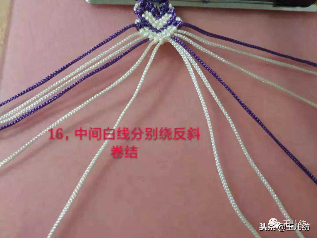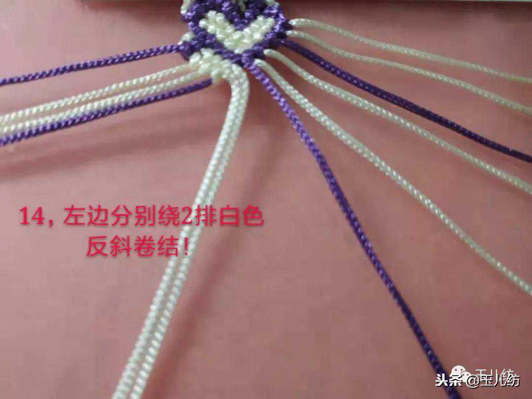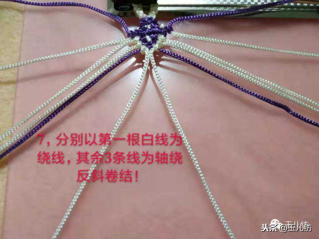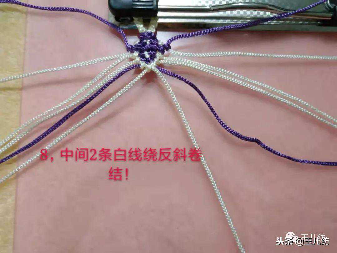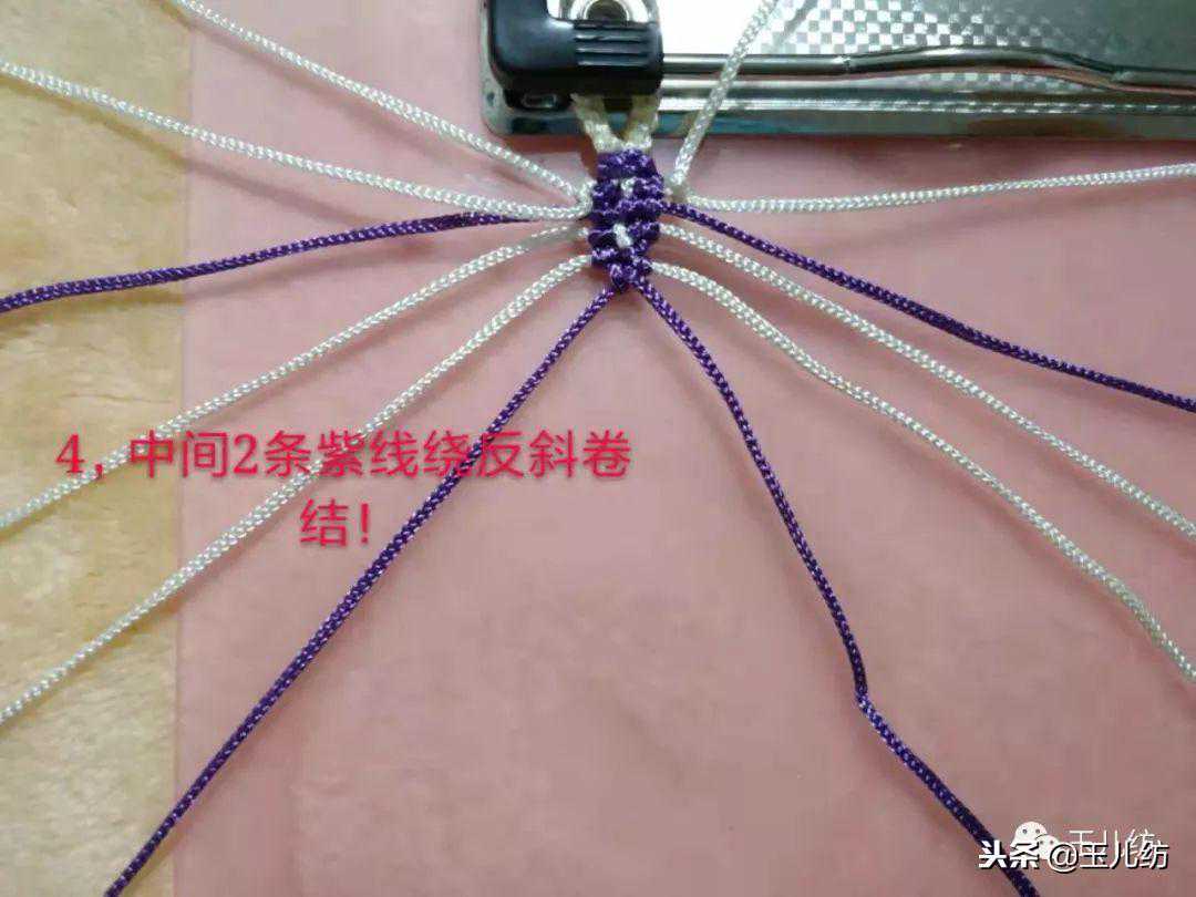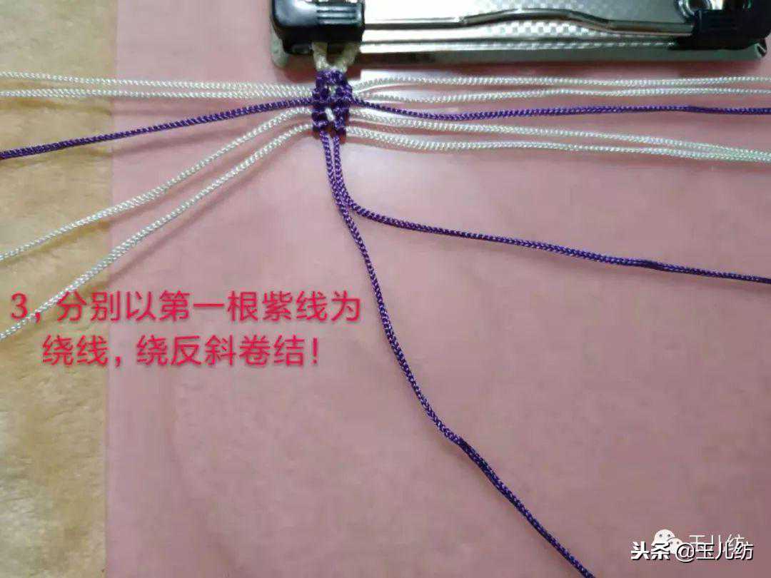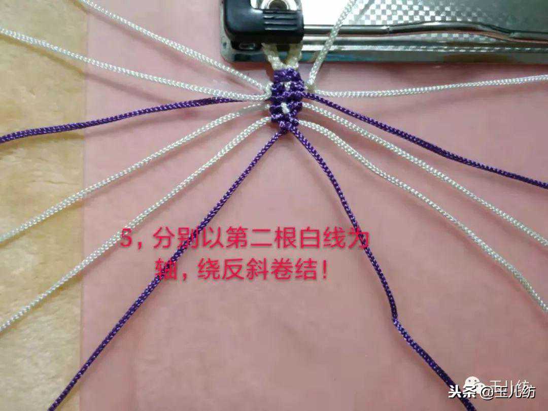 6,分别将第一根紫线在2根白线上绕反斜卷结。