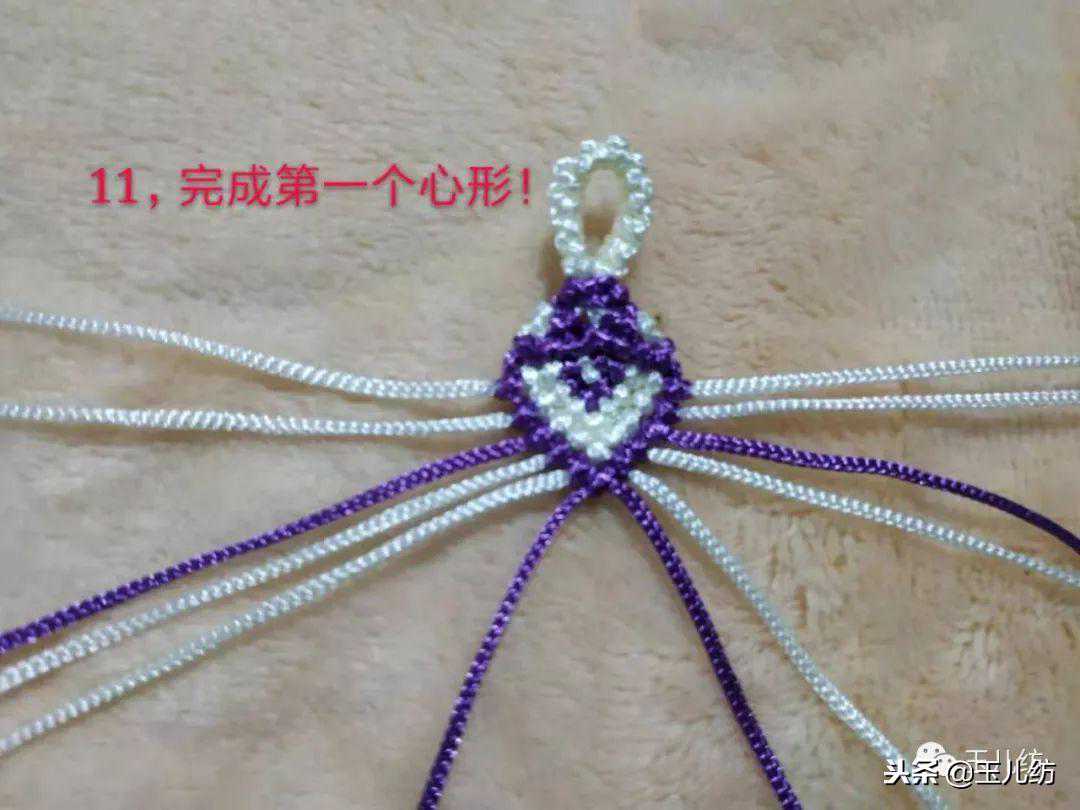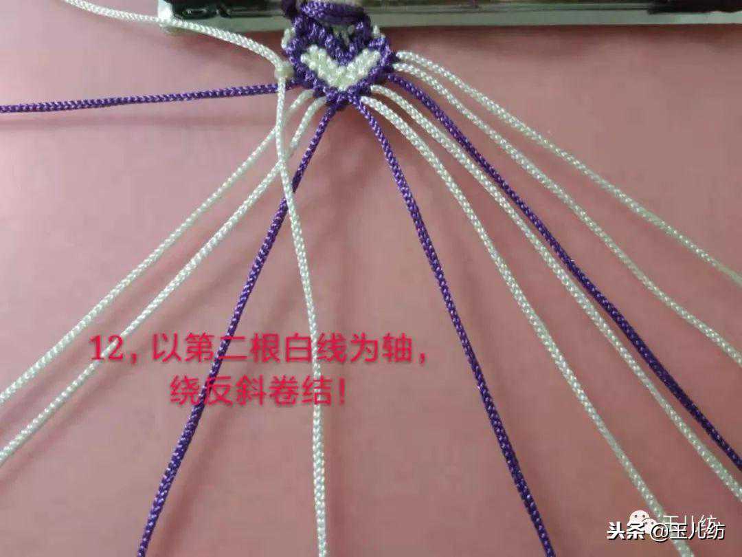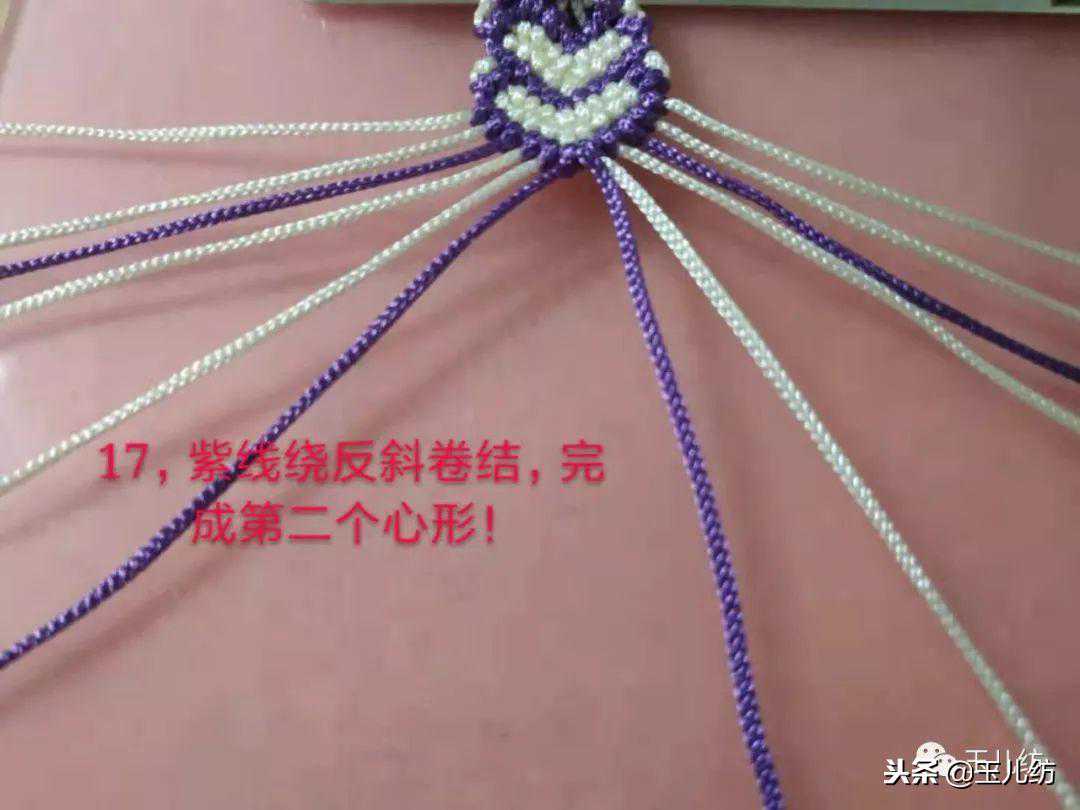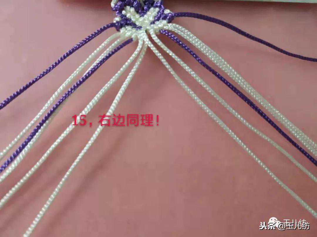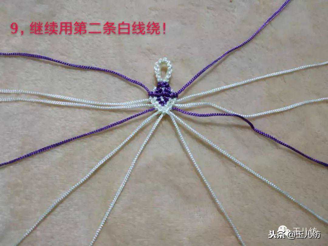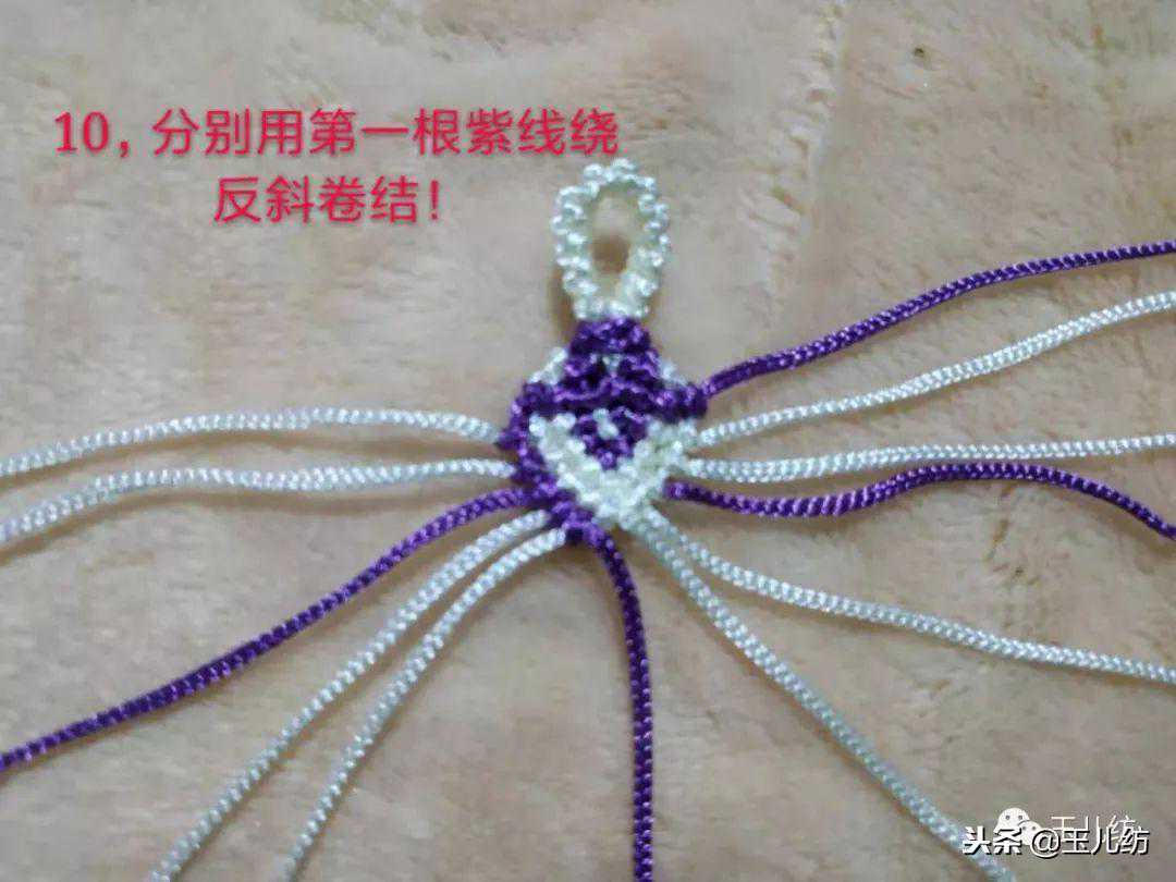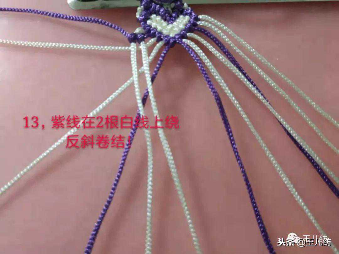 6,分别将第一根紫线在2根白线上绕反斜卷结。