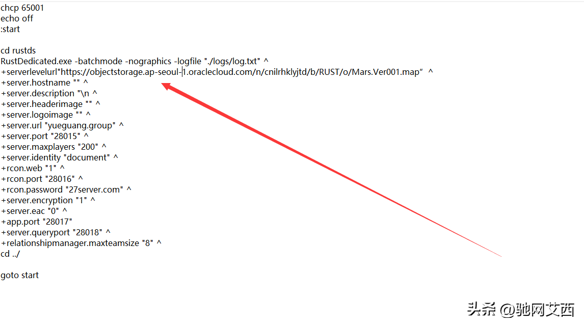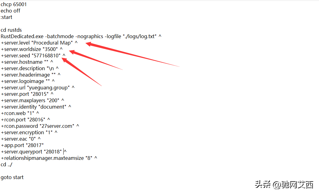 文件获取后将服务器启动bat配置文件修改一下将rust腐蚀默认的地图大小种子编号地图类型数值删掉添加定制地图链接(+serverlevelurl"”^)
