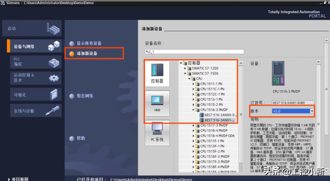 2、在【设备与网络】菜单栏中,选择【添加新设备】选项,查看实训箱中实际CPU的订货号及硬件版本;选择控制器一SIMATICS7-1500”-“CPU”-“CPU1516-3PN/DP”一“6ES7516-3AN01-0AB0”,硬件版本选择。根据自己项目需求进行添加CPU控制器。
