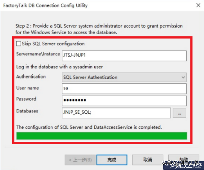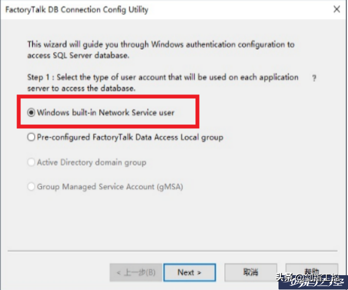 4、FactoryTalkDB连接配置实用程序:(1)“⑤”配置Windows身份验证(图2);(2)通过Windows身份验证配置访问SQLServer数据库;(3)选择在每个应用程序上用于访问数据库的用户账户类型:选择Windows内置网络服务用户(图3);