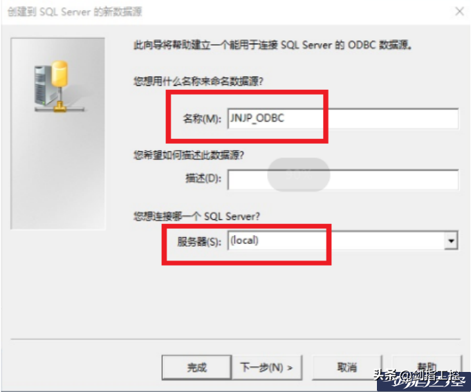 13、创建到SQLServer的新数据源,定义数据源名称为JNJP_ODBC,连接服务器选择local(图13),然后进行下一步;