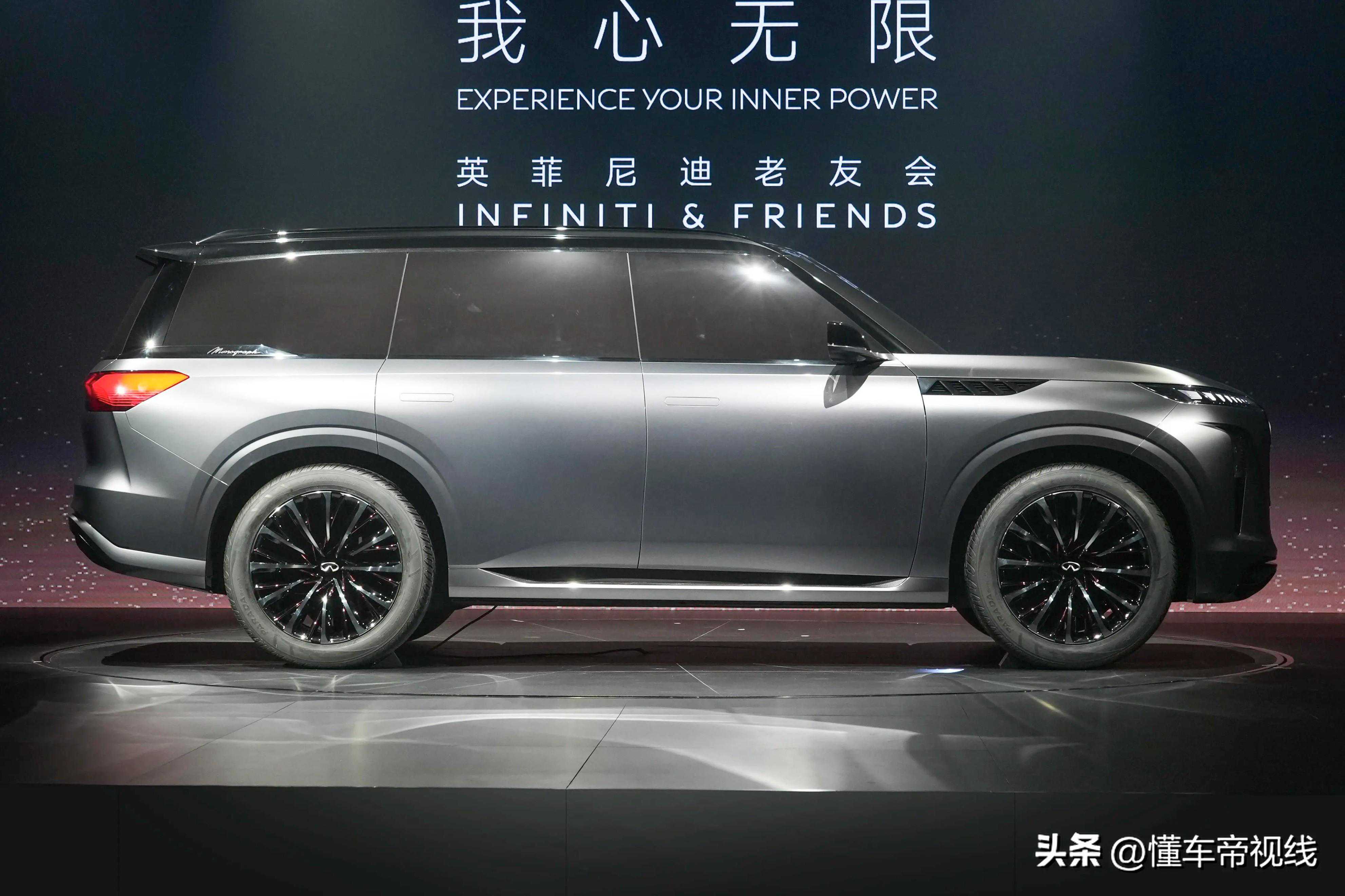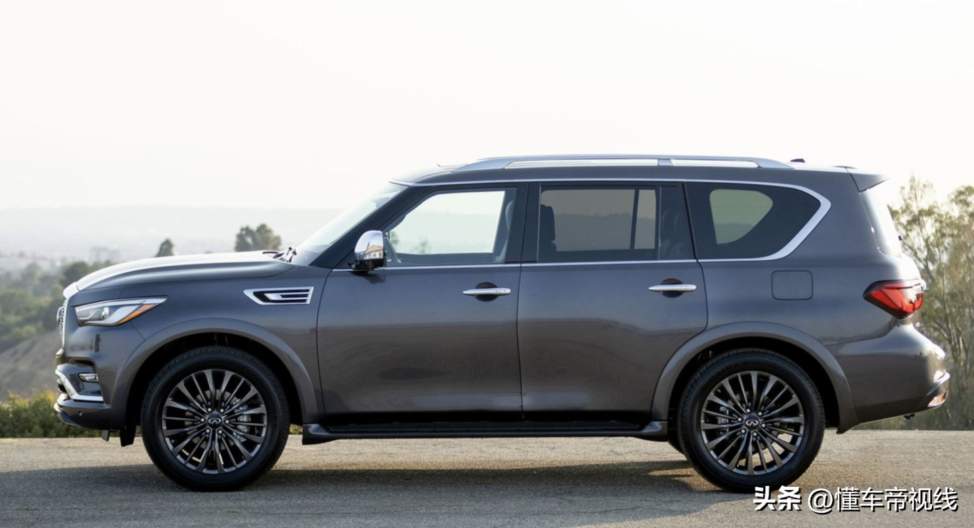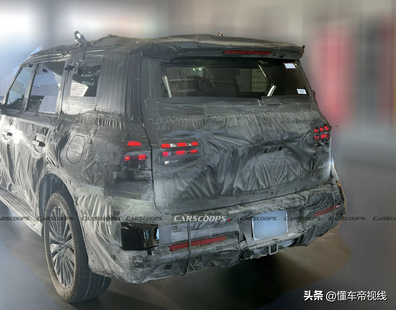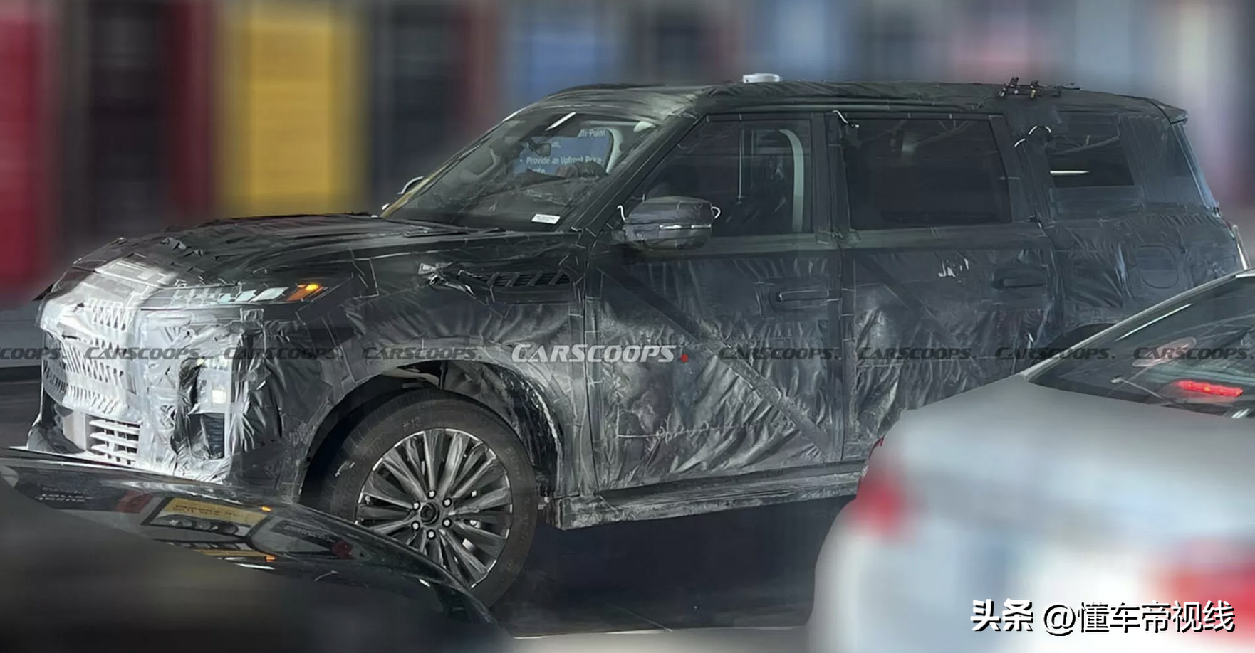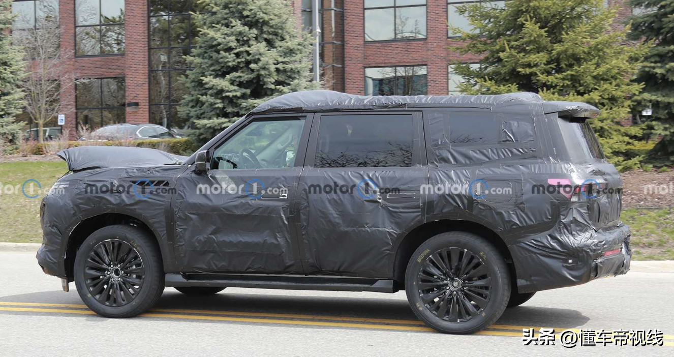 全新英菲尼迪QX80侧面轮廓基本延续了老款车型设计,不过C柱和D柱之间的侧车窗造型预计有所改变。值得注意的是,该车或采用隐藏式车门把手设计。