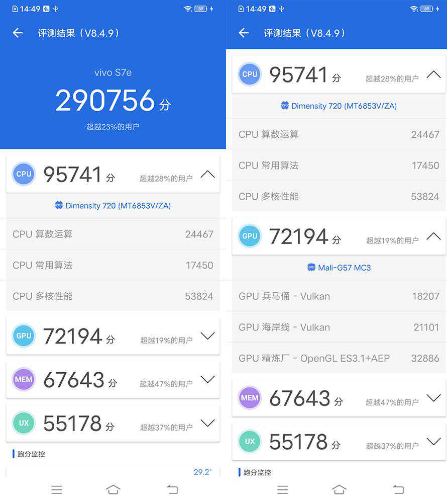 在安兔兔测试中,vivoS7e总分为290756分,其中CPU得分为95741分,GPU得分为72194分,存储器得分67643分,UX得分为551748分,中规中矩。