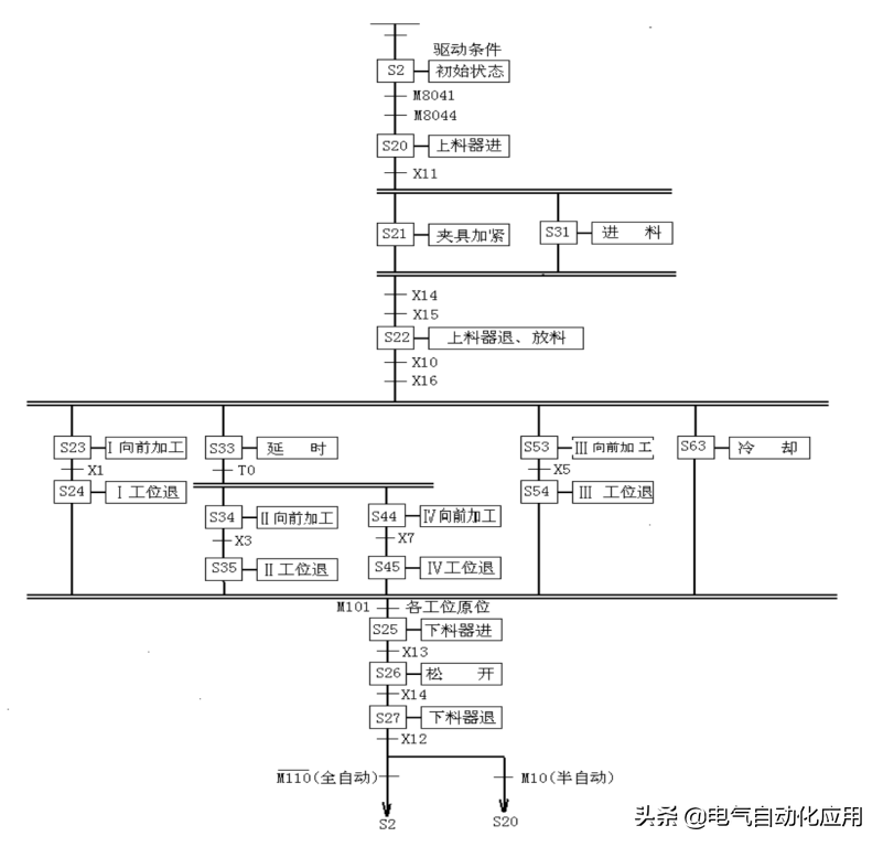 下图是组合机床控制系统全自动工作循环和半自动工作循环式的状态流程图。图中S2是初始状态,驱动它的条件是各滑台、各辅助装置都处在原位,夹具为松开状态,料道有待加工零件且润滑系统工作正常。