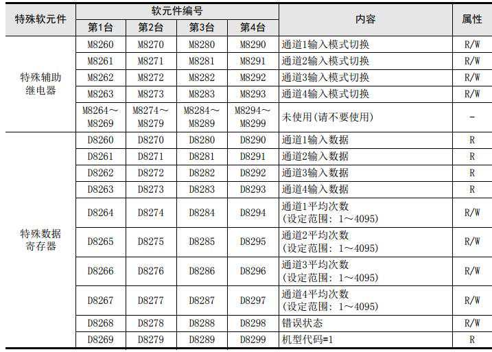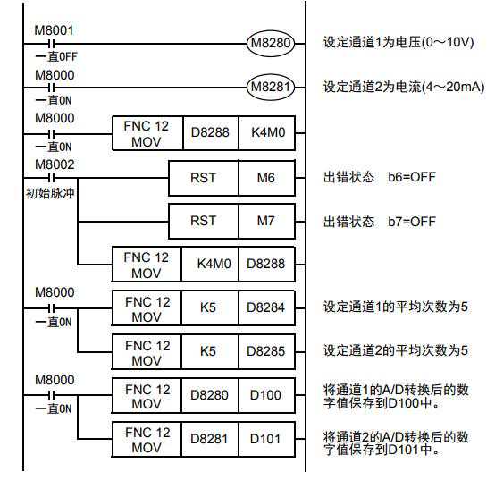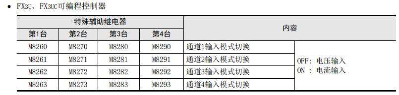 3)各通道的A/D转换值被自动写入FX3S、FX3G、FX3GC、FX3U、FX3UC可编程控制器的特殊数据寄存器中。