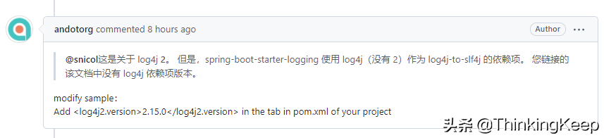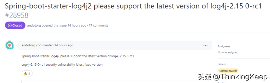 影响版本SpringBoot最简修复方式有小伙伴希望能通过SpringBoot的Starter快速解决,还给SpringBoot提了Issue,希望spring-boot-starter-log4j2能支持2.15的版本