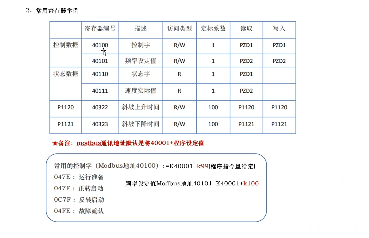3.)西门子V20变频器常用的读写modbus参数地址,如下图所示: