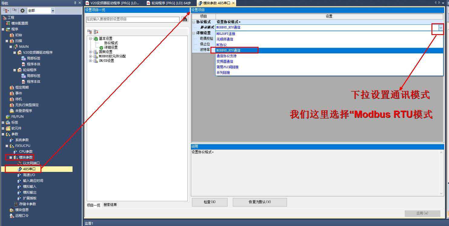 1.)设置PLC本体modbusRTU通讯协议如下图: