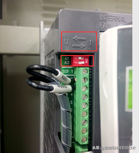 如图所示的拨码开关为:AI1端子接受的信号为电压,AI2端子接受的信号为电流(可根据自己的要求来设置)