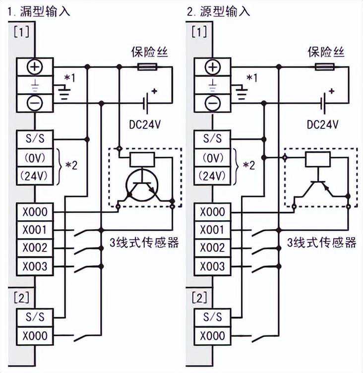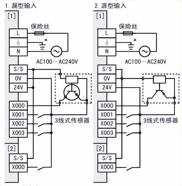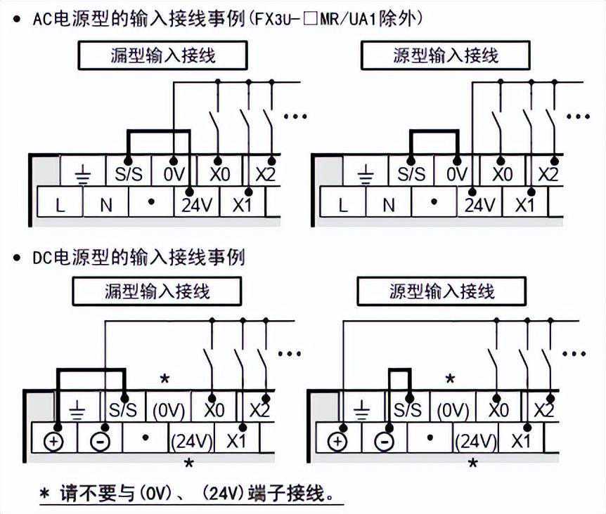 PLC的输入接线:主要有源型输入接线和漏型输入接线(三菱常用的漏型接线)