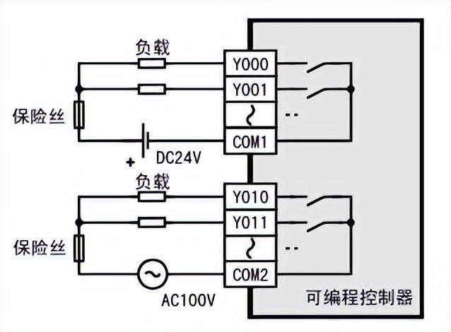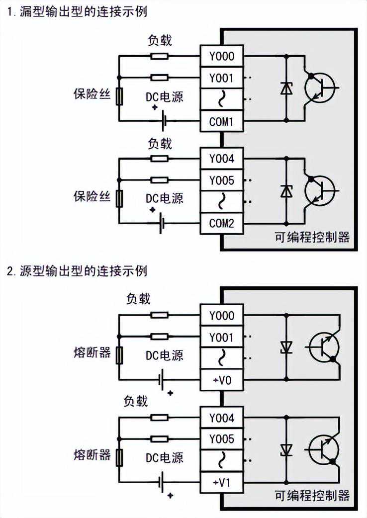 PLC的输出接线:也分为源型和漏型,同时根据输出类型的不同接线略有不同