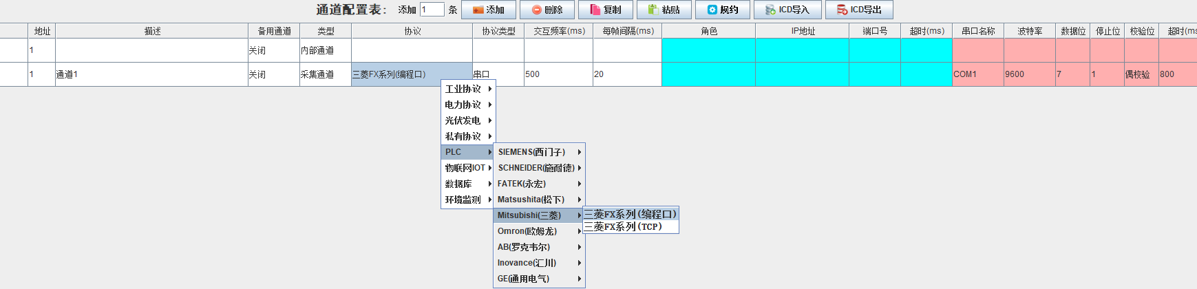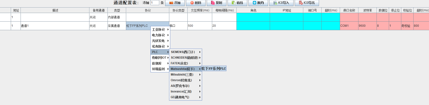新建一个采集通道,协议选择松下FP系列PLC,串口名称以实际情况为准,其它参数通常保持默认即可;
