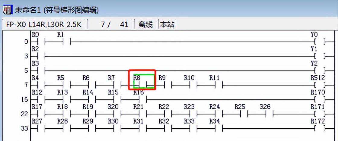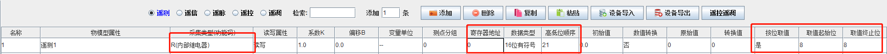 举例采集一个R8寄存器(见下图梯形图红框处),那么新建一个测点,功能码选择R(内部继电器),地址为0,数据类型选择16位有/无符号(以实际情况为准),数据格式选择21,在高级设置中,勾选按位取值,取值起始位8,终止位8;