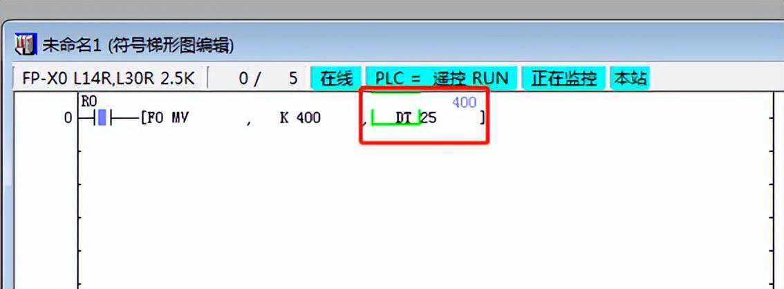 举例采集一个DT25寄存器(见下图梯形图红框处),那么新建一个测点,功能码选择D(数据寄存器DT),地址为25,数据类型选择16位有/无符号,高低位顺序通常选择21(以实际情况为准);