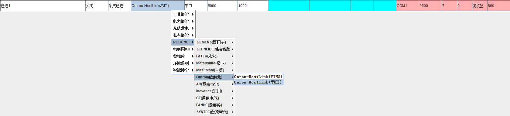 新建一个采集通道,协议选择Omron-HostLink(串口)(欧姆龙串口协议),串口的默认参数为标准配置,根据实际情况更改;