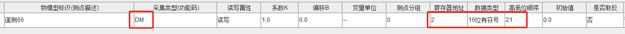 举例采集一个地址为2的DM寄存器(即D寄存器),那么新建一个测点,功能码选择DM,地址填2,数据类型选择16位有符号(以实际情况为准),数据格式选择21;