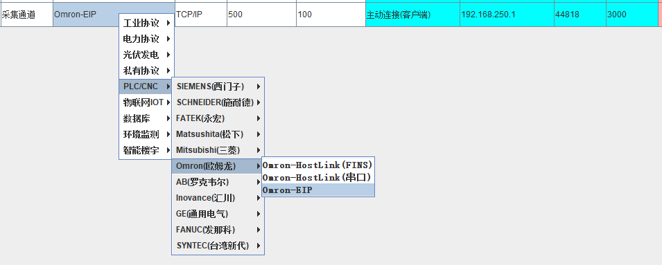 欧姆龙-Omron-EIPPLC数据采集新建通道新建一个采集通道,协议选择Omron-EIP(欧姆龙),IP地址填写PLC的IP地址,端口号默认44818;