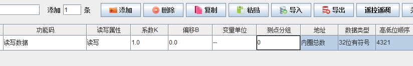 举例采集PLC中一个名称为内圈总数、类型为DINT的标签名,那么新建一个测点,功能码选择读写数据(默认),地址填内圈总数,按照PLC-网关测点类型对照表,DINT数据类型对应网关测点类型选择32位有符号,高低位顺序格式选择4321,根据实际需求修改系数、偏移;