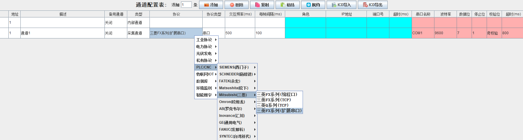 新建一个采集通道,协议选择三菱FX系列(扩展串口)(此处扩展串口指使用三菱的485-BD扩展模块),串口名称按照实际情况选择,其余参数保持默认即可;