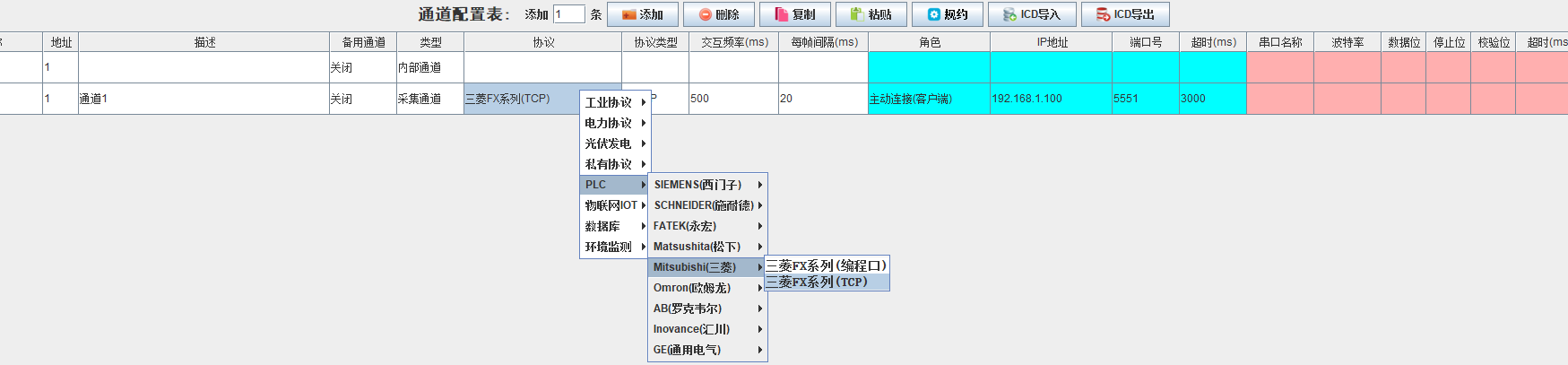 新建一个采集通道,协议选择三菱FX系列(TCP),IP地址按照实际情况填写,直连PLC时端口号通常为5551(或5556),其余参数保持默认即可;