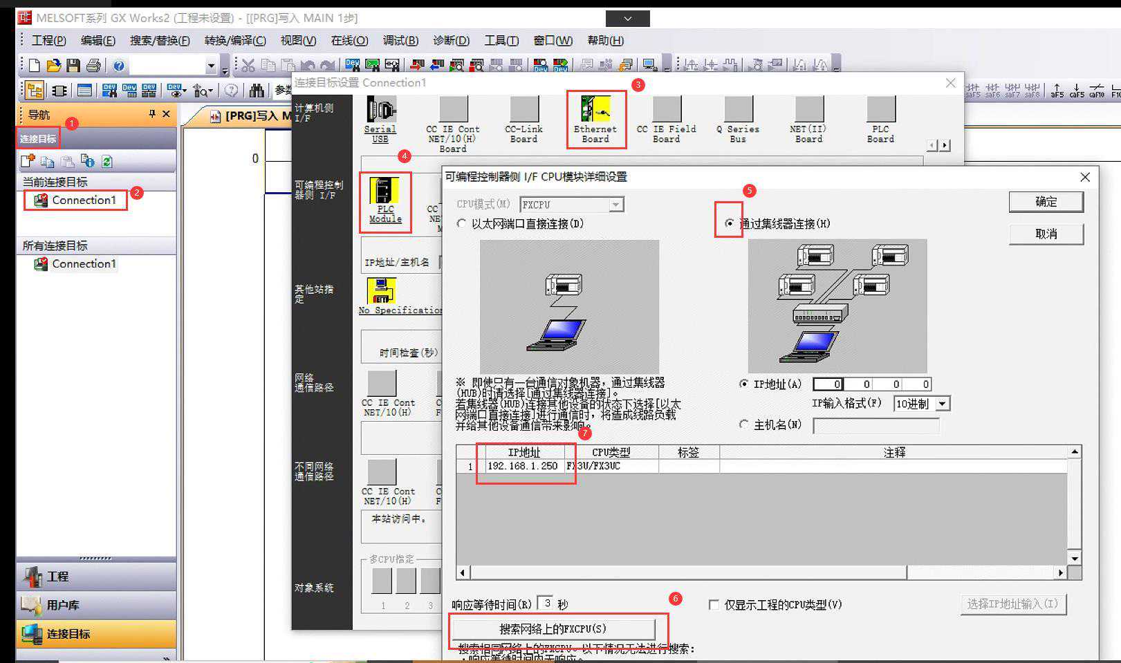 1、电脑网线和PLC直连,使用三菱编程软件搜索到PLC;