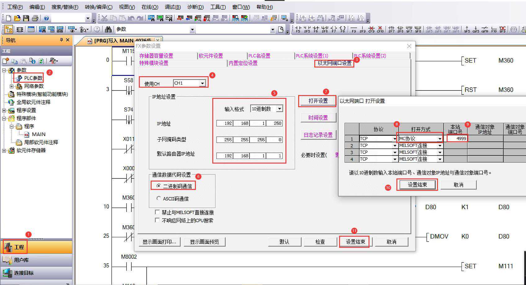 2、设置PLC对外的通讯协议(其中本站端口号按需配置,并非必须是4999),保存设置后,下装回PLC,下装完成后断电重启PLC。