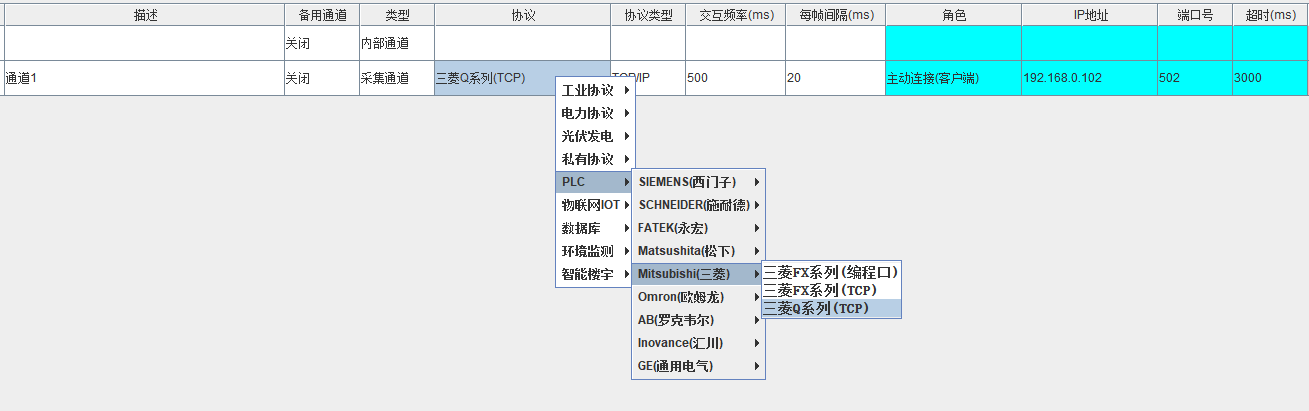 新建一个采集通道,协议选择三菱Q系列(TCP),IP地址填PLC的IP,端口号按照PLC编程软件里的配置填写,其余参数保持默认即可;