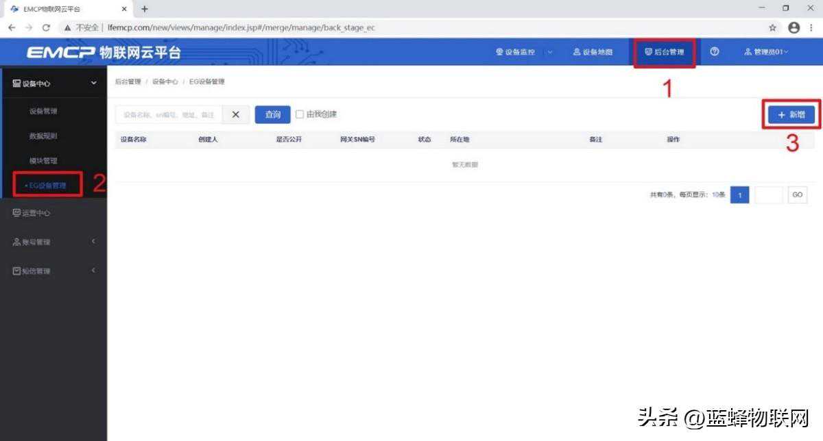 三EMCP平台设置用管理员账号登录EMCP平台(建议使用360浏览器极速模式、谷歌浏览器(GoogleChrome)或者支持Chromium内核的浏览器),对EMCP云平台进行设置。具体操作参照《EMCP物联网云平台用户手册》。登录EMCP后首先进入设备列表显示页面,因为我们未创建任何设备,所以是一个空页面,我们需要按照以下步骤进行操作。