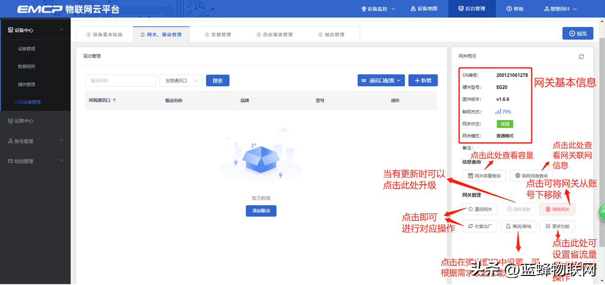 河北蓝蜂科技的EG20网关一台,天线和电源适配器(以下用EG20作为实例)。