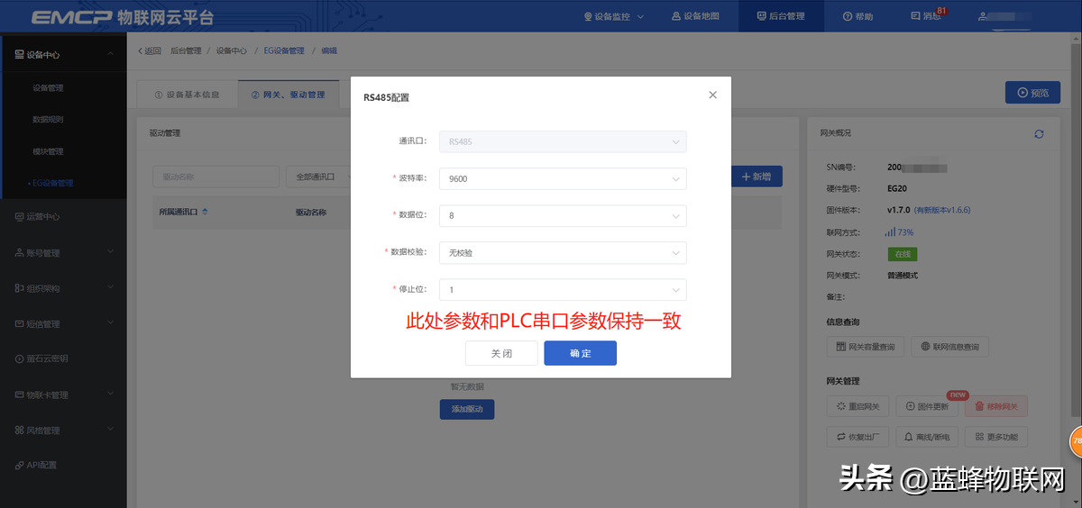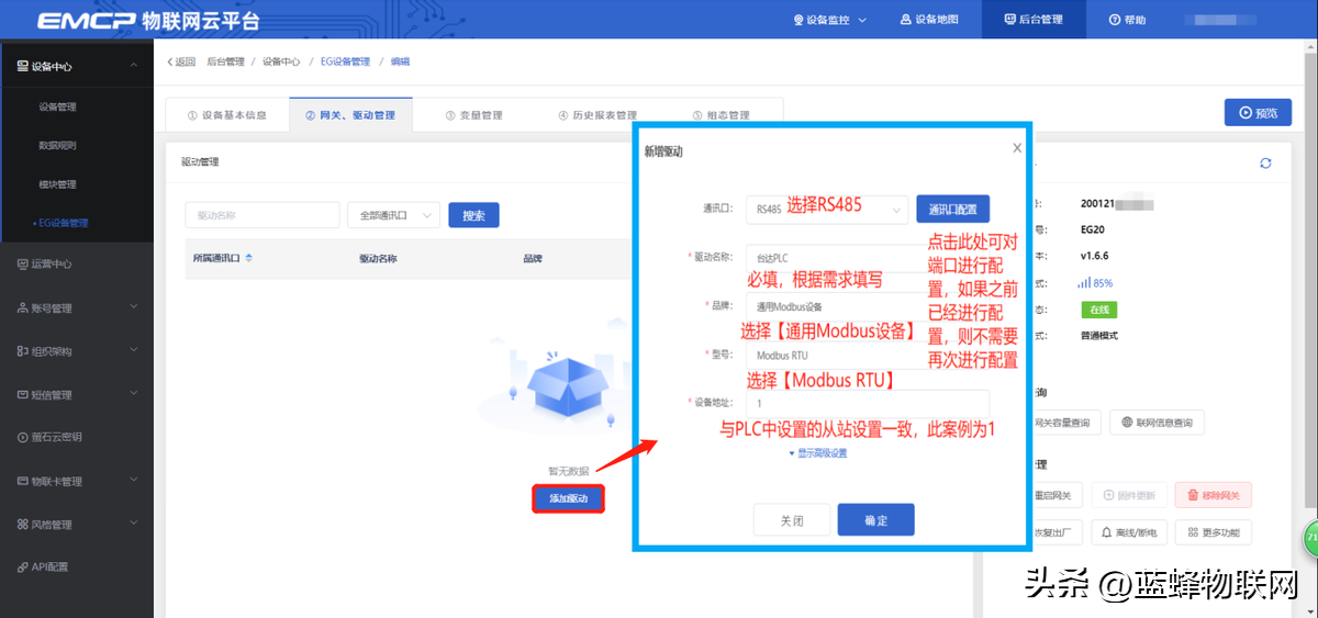 EG设备管理网关配置中最主要两个地方需要配置,一是配置网串口通讯参数,二是创建modbus驱动,下面分步骤对此功能进行讲解。注:网关只有在线后才可以进行远程配置。