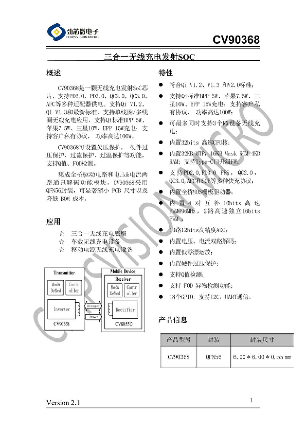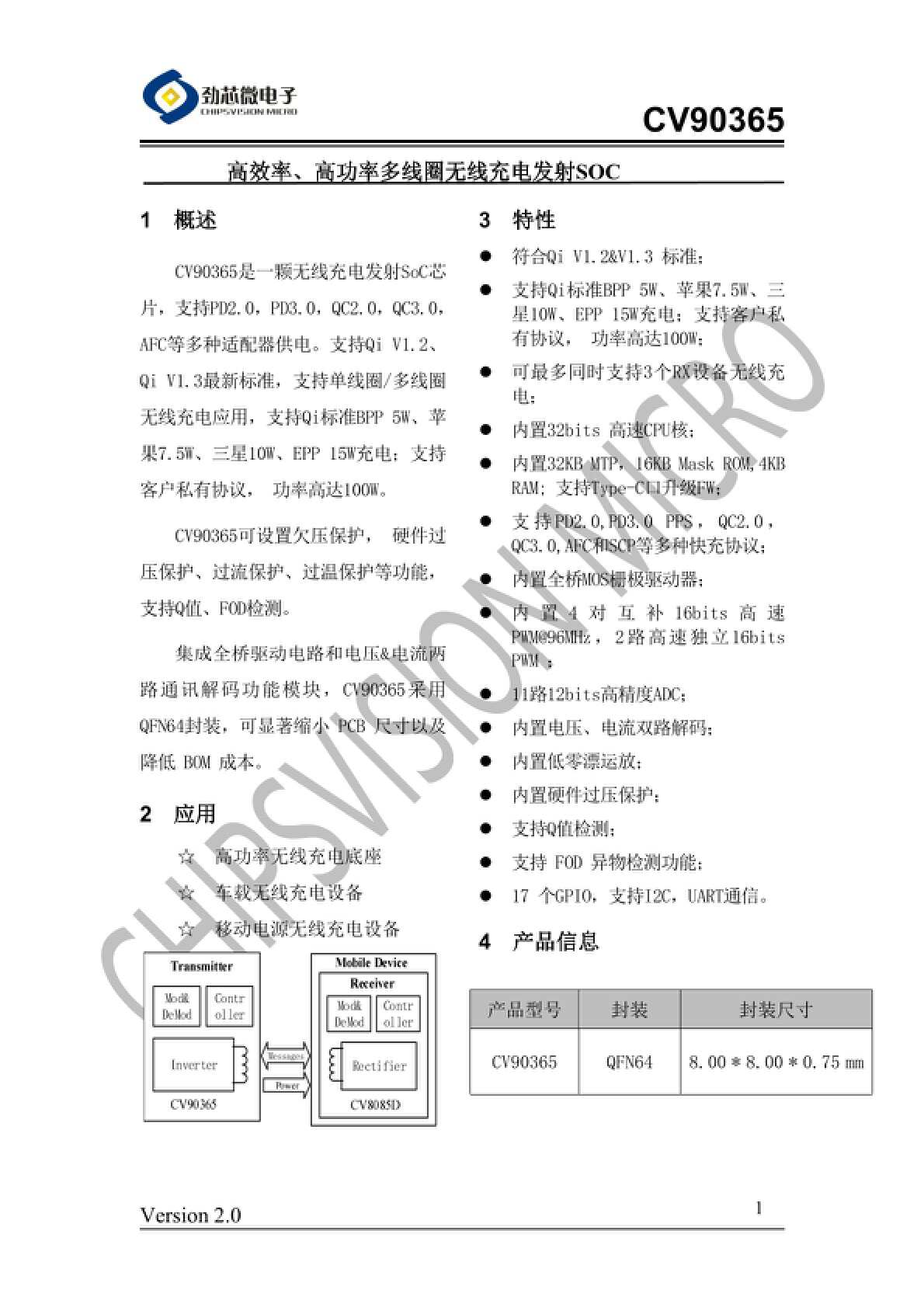 劲芯微CV90363CV90363是一颗无线充电发射SoC芯片,支持,,,,AFC等多种适配器供电。支持、最新标准,支持单线圈/多线圈无线充电应用,支持Qi标准BPP5W、苹果7.5W、三星10W、EPP15W充电;支持客户私有协议,功率高达100W。