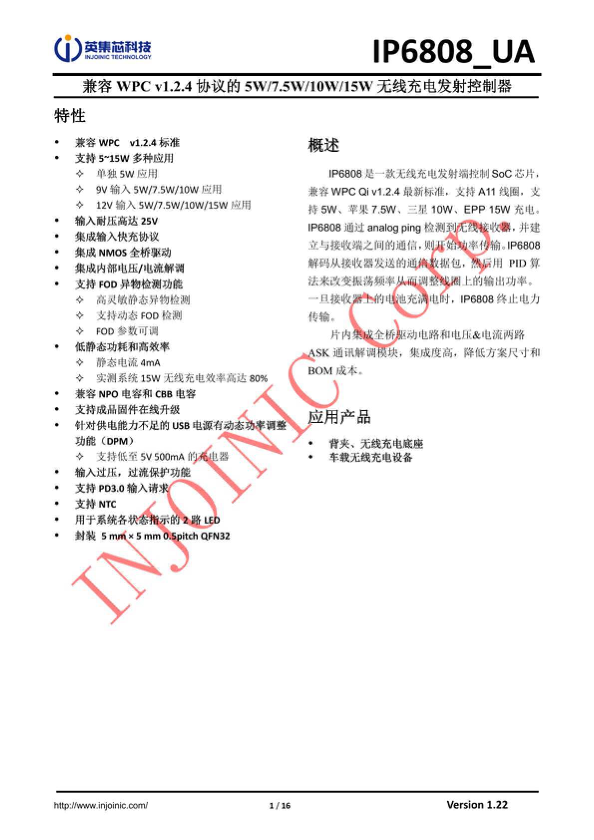 英集芯IP6801IP6801是英集芯新推出的一款高集成度,符合WPCqi标准的无线充电发射控制芯片,最高支持15W无线充电,支持为5V500mA适配器与PCUSB接口供电。IP6801内部集成H桥驱动模块、ASK通讯解调模块、适配器快充Sink协议等必要的无线充电资源。