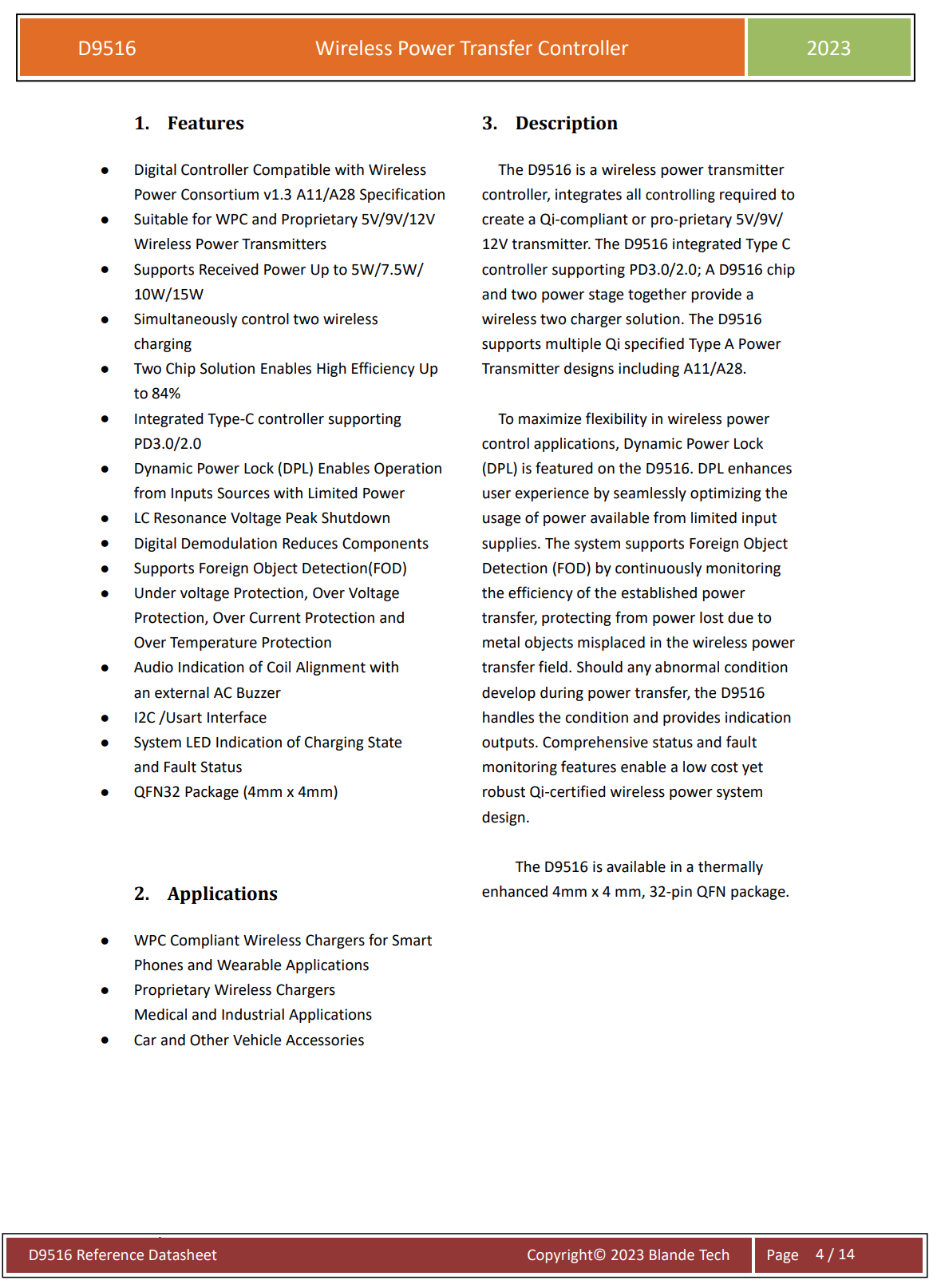 SC9608支持4-14V输入电压,内置32位数字内核,具备丰富的内存和外设,支持和BPP以及私有的无线充电协议。SC9608采用4*4mm,FCQFN-25倒装封装,可获得更佳的散热性能。适用于兼容WPC的无线充电发射器和私有协议的无线充电发射器应用,可实现简化的高集成无线充电器设计。