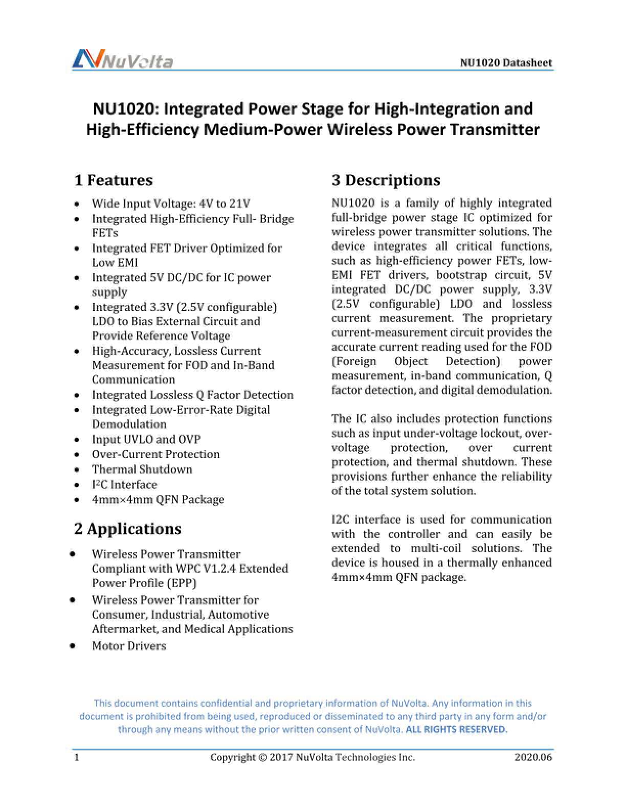 NU1020内置了多种保护功能,如输入欠压锁定、过压保护、过流保护和热量关机功能,进一步提高了整体系统方案的可靠性。它还包含一个I2C接口,用于与控制器的通信,可以轻松扩展到多线圈方案。该设备采用了具有优化热性能的4mm×4mmQFN封装,以确保稳定可靠的运行。