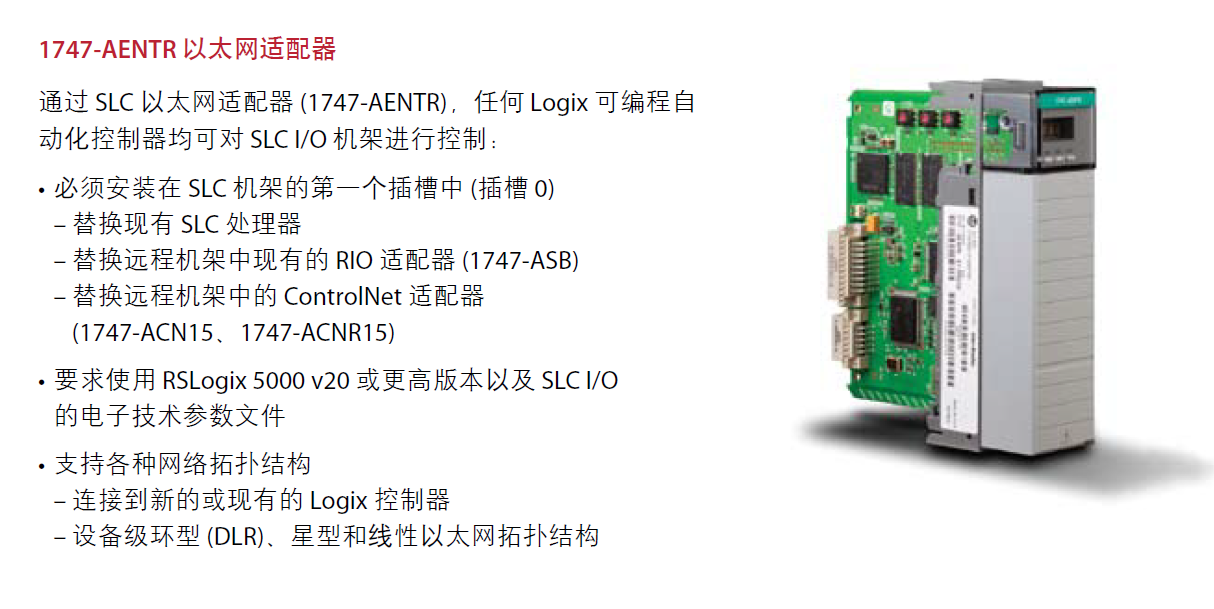 通过SLC以太网适配器(1747-AENTR),任何Logix可编程自动化控制器均可对SLCI/O机架进行控制: