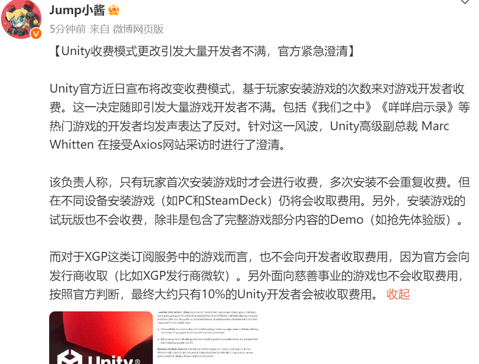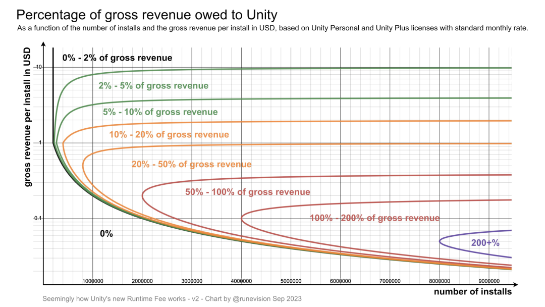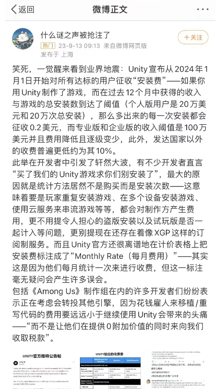今天(9月13日)早上,葡萄君发现朋友圈又刷屏了,许多从业者都在讨论同一件事:Unity新发布的「安装费」收费模式——简单来说,在2024年1月1日后,那些收入和安装量达到门槛的Unity产品,不论是独立游戏还是免费游戏,每月可能都要多交一笔钱了。
