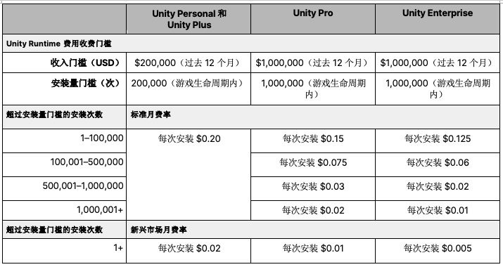 更具体地说,Unity的收费标准还分为两类和三档:根据安装用户所在的国家/地区,以及开发者使用的Unity版本差异,每次安装费用将从0.005美元至0.2美元不等,详细信息可以参照下面这张表。