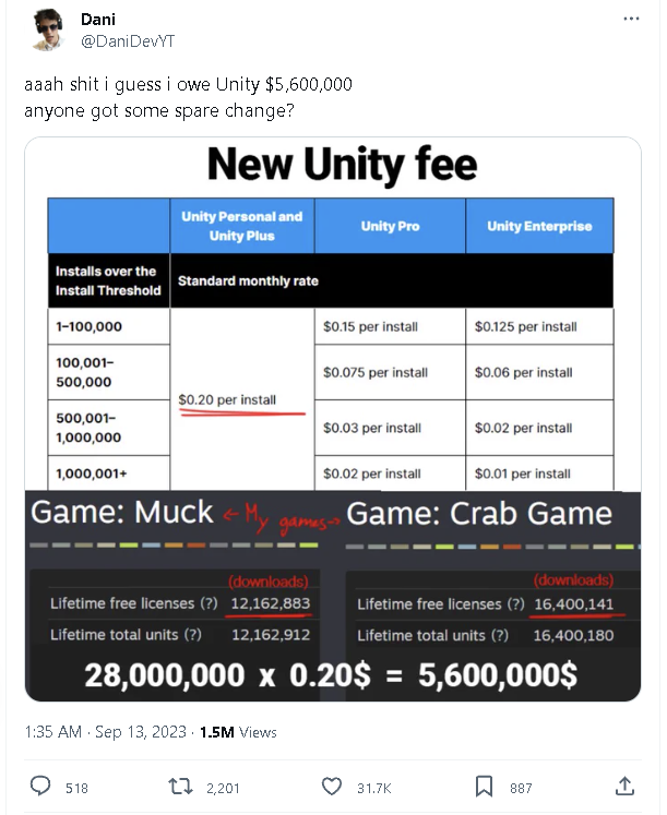 当然,他也声明了这只是玩笑式的计算方法,不能当真。因为Unity说了:只有从新规发布后签约的开发者,才会在2024年开始算这笔账。但如果今年这12个月的数据达标,那么从明年开始执行后,他确实就得为每月的安装量付一定费用了。