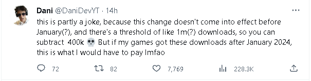而对部分运营大DAU产品,或是有能力稳定产出高质量独立游戏的中小团队来说,这样的新规也意味着他们需要重新做一些规划了。在推特上,已经有一些团队表示将做出应对动作,比如赶在明年之前下架游戏,或是调转方向,准备使用其他引擎移植当前产品、开发后续产品。