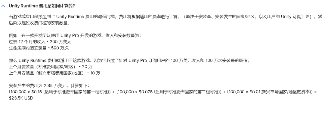 我们先来看一个官方给出的计算示例:假设某团队使用UnityPro开发游戏,过去一年收入为200万美元(约合1456万元)、安装量为500万次,它就达到了Pro版本的双百万门槛。如果它上月在发达国家/地区的安装量为20万次、在发展中国家/地区为10万次,最终计算下来,这一月要交的安装费就是2.35万美元(约合17万元)。